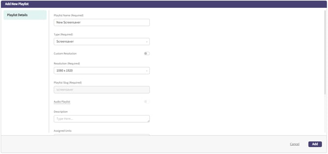 Fill out the fields and click Add to save your changes. You will only be able to select a resolution from the drop down options if a unit matching that resolution exists in your account. If you instead need to create a playlist with a custom resolution (banners, ad space, etc), you're able to enter a custom size by toggling "Custom Resolution".