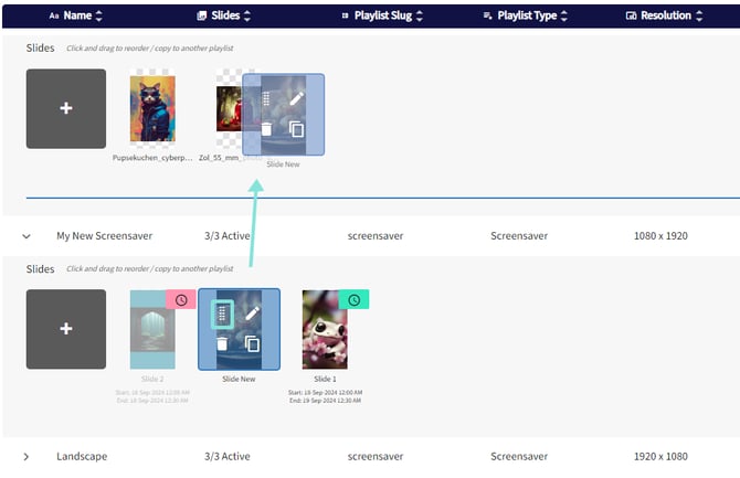 If you have multiple playlists, you can also drag a slide from one to another, which will add a copy of that slide to the playlist.